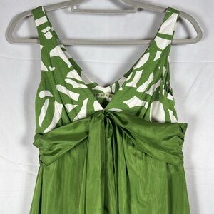 Features: green mini dress, empire waist dress, tropical print top, sleeveless dress, tie front dress, v-neck sundress, bold leaf print, summer dress, two-tone dress, lightweight fabric, Retro Vintage Style