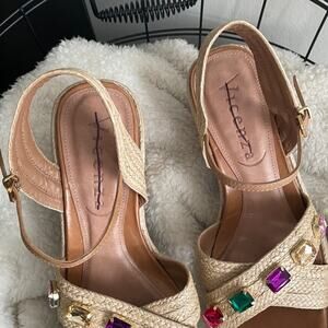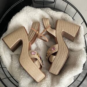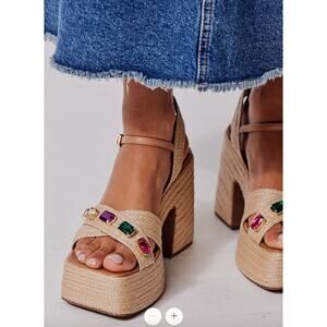 Details: Slip-on style, braided raffia uppers, square open toe, criss-cross toe strap, adjustable buckle ankle strap, platform sole, chunky block heel, jewel accents, lined footbed.