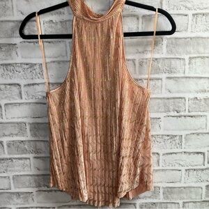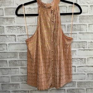 This Sleeveless Halter Top features a pleated Shimmery style with a halter neck line. The back features dainty buttons from top to bottom