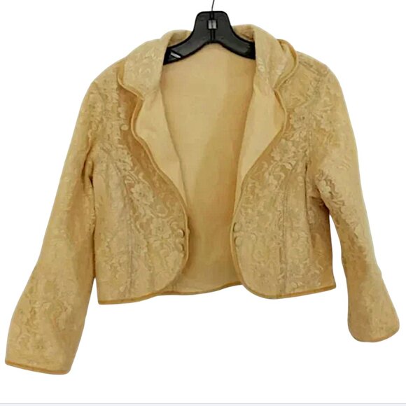 This Anthropologie jacket, with its cropped design and reversible lace/corduroy fabric, is perfect for any occasion. The lightweight jacket features a collared neckline and open front making it comfortable and easy to wear. Whether you're dressing up or dressing down, this Anthropologie jacket is a must-have for any fashion-forward woman. Cute with everything from a frilly skirt to jeans.