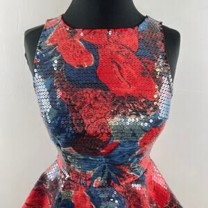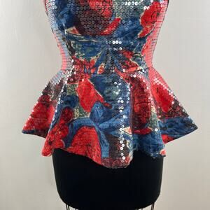 Anthropologie WOLVEN Sequin Peplum Top Red Blue Round Neck Sleeveless Size 0
