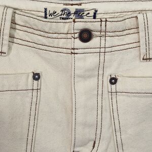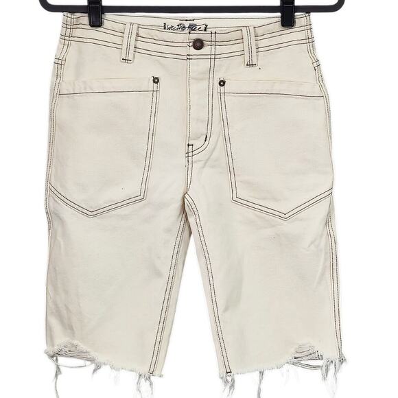 These We The Free shorts bring a warm-weather staple into sharper focus—off-white denim with a raw hem and oversized contrast stitching for a subtle pop. Women’s size 25. High rise fit with soft structure and light fraying at the cutoff edges, they hold their shape while staying relaxed through the hips. Clean front pockets and a hint of stretch keep them functional without fuss. The modern neutral tone plays well with anything, whether you're packing light or layering textures.