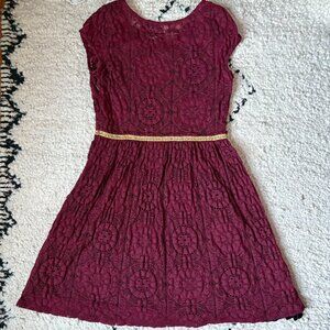 Anthropologie Weston burgundy red lace fit flare dress gold belt women's large