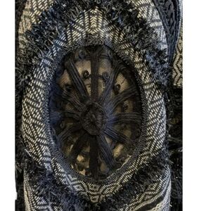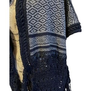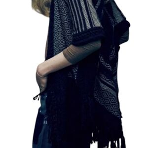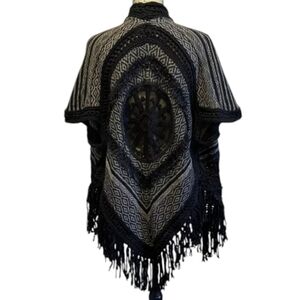 Colors: Tan and Black- neutrals Crochet and fringe trim- mesh back panel with Mandela design- open cardigan poncho style