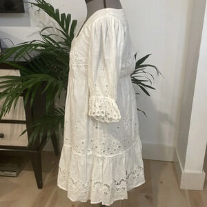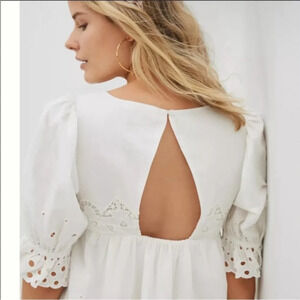 Chic white dress with eyelet details. Features puff sleeves and a square neckline. Perfect for casual outings.