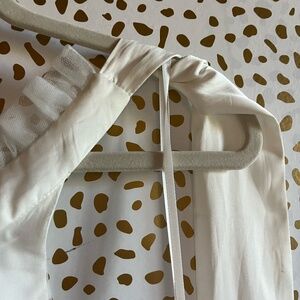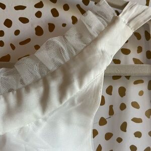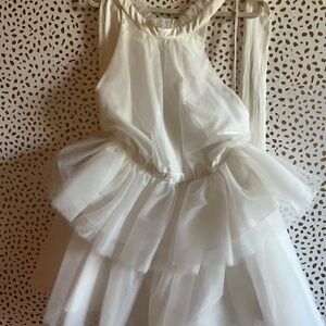 Elegant white halter dress. Features layered tulle skirt. Perfect for a bachelorette party or wedding reception dress! I wore it briefly for my wedding and got many compliments. The dress has been dry cleaned and is in excellent condition!