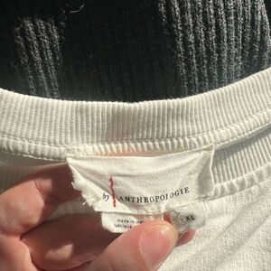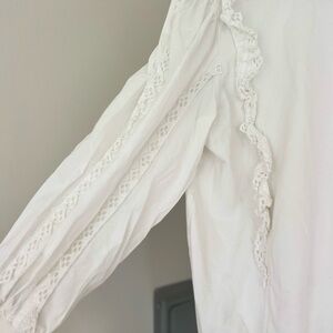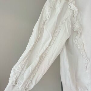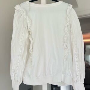Anthropologie white lace ruffle balloon sleeve pullover top. Please let there is a tear on the sleeve as pictured. I’ve priced this as is. Size XL.