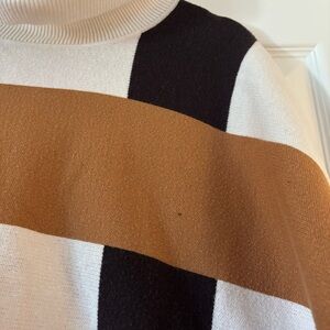Stylish poncho sweater with bold stripes. Features a cozy turtleneck. Perfect for layering.