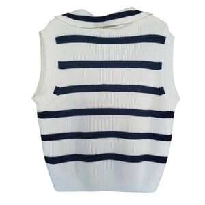 Stylish v-neck sweater with bold black stripes. Sleeveless design. Perfect for layering.