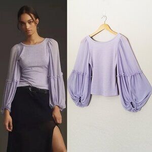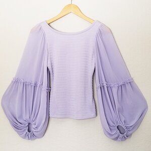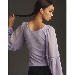 Anthropologie Wide Sheer Balloon-Sleeves Smocked Top XS Lilac Lavender Romantic