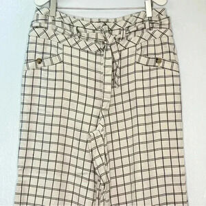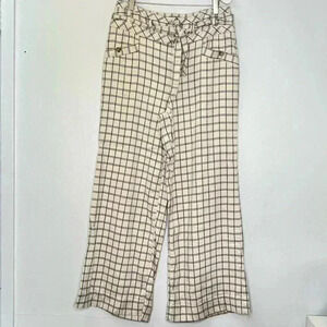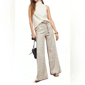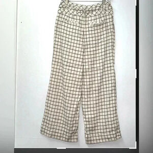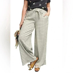Anthropologie Windowpane Trousers Wide Leg High Rise Belted Ivory Sz M