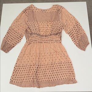 Chic peach dress featuring a tie-front. Adorned with black dot pattern. Ideal for casual wear.