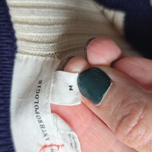 Stylish cream sweater I'm decluttering my closet and letting go of this lovely ribbed sweater 🧶. It has navy trim and can be worn open like a cardigan or buttoned up as a sweater. Perfect for adding a touch of chic to any outfit ✨. Let me know if you're interested!l 📩