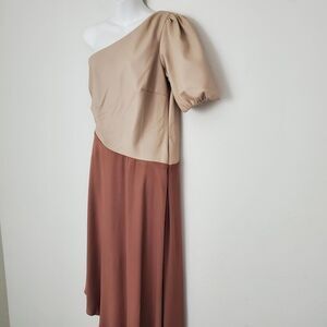 by Anthropologie women's dress - asymmetrical hemline, one shoulder, faux leather bodice, A-line skirt and puff sleeve, lined skirt and hidden side zipper. Beige and pink.