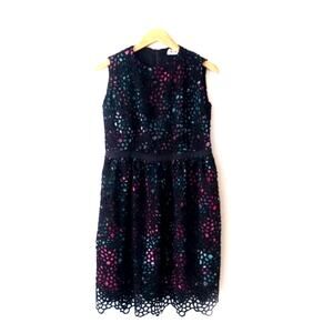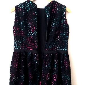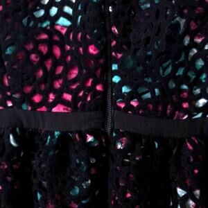 Anthropologie women’s dress from the Wolven Collection featuring a black lace overlay with deep pink and teal jewel tones beneath. Women’s size XS. The structured bodice and scalloped lace hem bring a rich romantic energy that blends whimsigoth’s dark elegance with coquette softness. The layered contrast fabric catches light subtly, giving it a moody yet feminine dimension perfect for evening wear or artistic settings.