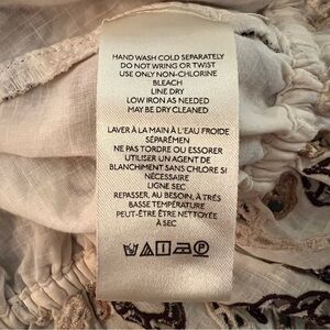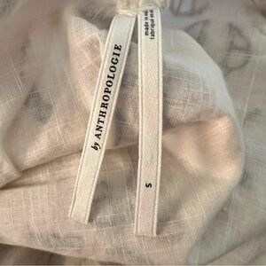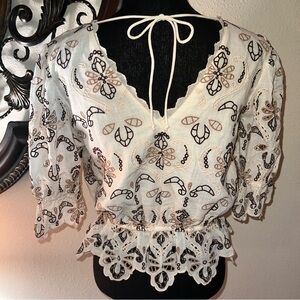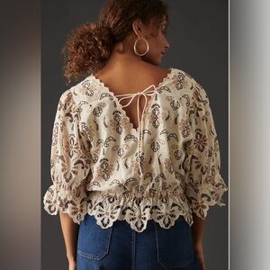 Anthropologie Women’s 100% Cotton, Eyelet, Pullover, Peplum Top, with V-Neck, V-On Back, 3/4 Puff Sleeves, Embroidered Floral Design, Scalloped Hem, Tie Across Back on Shoulders, and Cinched Waist ***SOLD OUT ONLINE*** 100% Cotton. No holes or stains. Size: Large