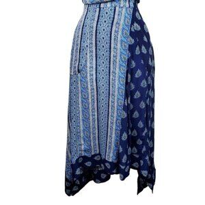 Anthropologie Maeve eclipsed faux wrap midi dress in blue and white. Surplice v-neck neckline. Side zip closure. Scarf handkerchief hem. Paisley print. Skirt is lined. Pockets. No stains or holes. Casual spring summer fall garden party picnic boho midi dress.