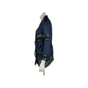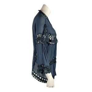 This boho-inspired kimono cardigan exudes a laid-back charm, perfect for breezy days or layering. The navy blue hue is complemented by intricate crochet trim, lending it an artisanal touch. Its sheer fabric creates an airy feel, making it both comfortable and stylish. An open-front design enhances its versatility for casual or dressier ensembles.