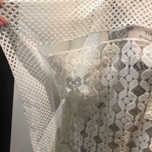 Elegant white lace poncho top. Features intricate lace patterns and a flowing design. Sheer. Sleeveless. Made of polyester.