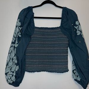 Anthropologie Women’s Small Smocked Embroidered Sequins Puff Sleeve Blue Top