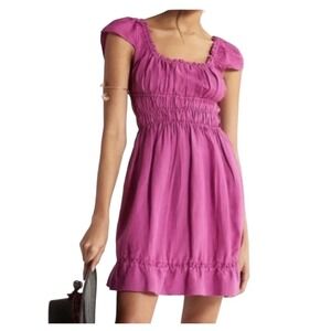 Anthropologie Womens Smocked-Waist Mini Dress Cap Sleeve Linen Raspberry Medium