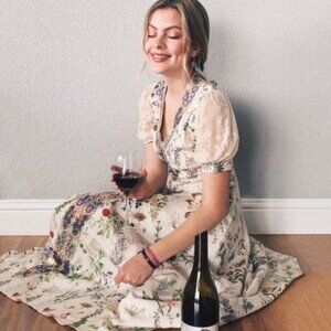 Romantic and timeless, this Anthropologie dress features intricate floral embroidery on a soft cream background with a beautifully detailed central panel. Designed with short puff sleeves, a flattering V-neckline, and a flowy midi silhouette. Fully lined with a hidden side zipper for a smooth fit.
