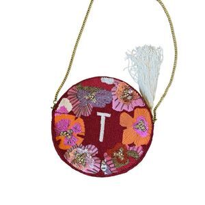 Anthropologie Womens Red Pink Monogram T Embellished Chain Strap Round Pouch