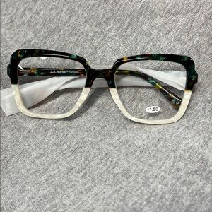 Stylish square glasses with a tortoise shell pattern. Features a blend of green, brown, and cream colors.