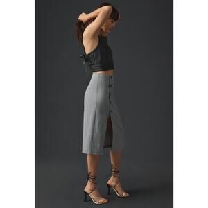 This brand-new Anthropologie Asymmetrical Button-down Skirt adds a stylish touch to your wardrobe. It features a charcoal and light grey checkered pattern, made from a blend of polyester and elastane for a comfortable fit.