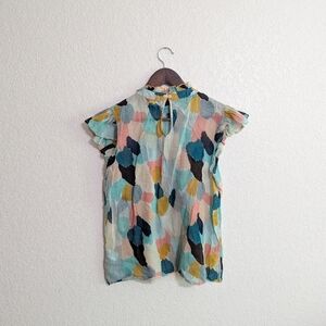 Paint splotch design. 100% Cotton. Very lightweight material. High ruffle neck with a button in the back. Excellent condition. Just a few wrinkles. Wear over a white bralette or sheer lacey long sleeve.