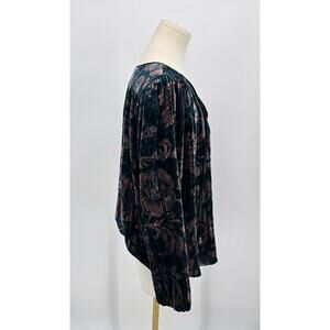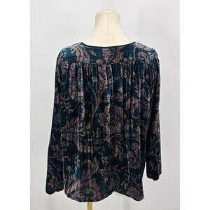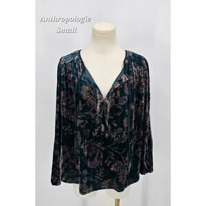 Bohemian romance meets luxe texture in this Anthropologie XI “Faustine” blouse. Crafted in a soft burnout velvet with painterly florals in deep teal, rosewood, and mauve tones. The relaxed silhouette, billowy sleeves, and notched neckline create an effortlessly elevated look that pairs beautifully with denim or corduroy.