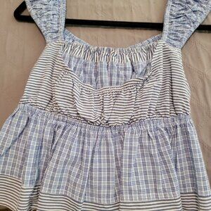 Anthropologie, size XS, semi-crop length, blue and white stripe/plaid design, off the shoulder peasant style blouse/top. 100% cotton. Can be worn on shoulders or off, tie in back to make tighter. Mint condition. Can be worn with jeans or shorts. Mixed patterns in mixed navy and lighter blues with white.