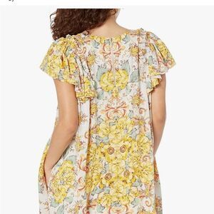 This charming sundress from Anthropologie features a vibrant yellow and pink color palette, perfect for casual or resort wear. The dress showcases a ruffled, tiered design with flutter cap sleeves and a crew neck, offering a playful and breezy silhouette. Its mini length and light fabric make it an ideal choice for warm weather outings. Arm pit to arm pit, 20 inches.