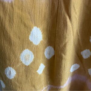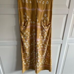 Chic yellow jumpsuit with white patterns. Cap sleeves and wide-leg design. Ideal for casual wear.