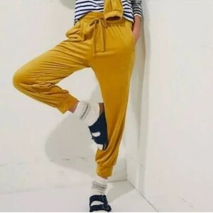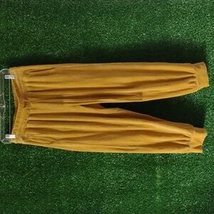These vibrant yellow track pants from Anthropologie feature a high-waisted design and elastic cuffed ankles for a comfortable fit. The relaxed silhouette and soft fabric make them perfect for casual outings or light activities, adding a bold touch to your wardrobe.