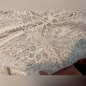 Lining is not included. This is a simply stunning dress from Parisian designer Yoana Baraschi. Sold in Anthropologie, this dress is a show stopper. You can wear a liner underneath and have a dress, or use it as a beach coverup. The gorgeous crochet detailing makes this incredibly unique. Snap closure. Tassels. V-neck. White color. See through eyelet crochet design.