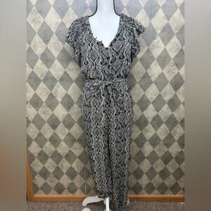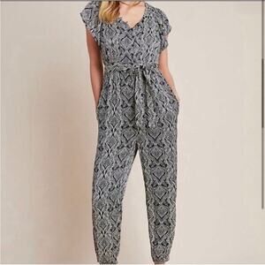 Chic and comfortable, this black and white printed jumpsuit is a must-have for effortless everyday style. Featuring a flattering v-neckline with front button details, short flutter sleeves, a self-tie waist belt, and ankle-length tapered legs with gathered hems. The eye-catching boho-inspired print makes it perfect for dressing up or down—pair it with sandals or wedges for a polished look.
