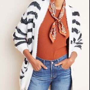 With a playfully zebra-printed finish, this eyelash cardigan offers a dreamy, modern take on cold-weather styling.