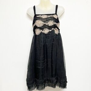 Anthropologie Zehavale Black Ruffle Floral Detail Silk Blend Mini Dress Sz 2