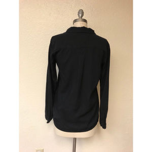 Loose fitting black long sleeve top with buttons at neck and wrists. Please note, the top is longer in the back. Approximately 23 inches long in front, and 26 inches long in back.