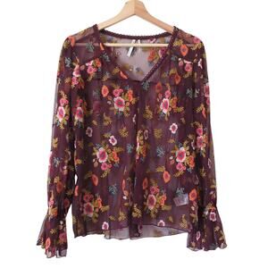 Anthropologie by Feather Bone Floral Embroidered Mesh Blouse Maroon Multi Small