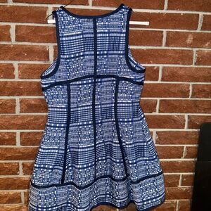 NWT This Anthropologie dress showcases a stunning blue and white geometric pattern, perfect for a cocktail night out. The sleeveless neckline complements the fit and flare style, creating a flattering silhouette. Its mini length adds a playful touch to the sophisticated design. Full zip front.