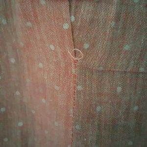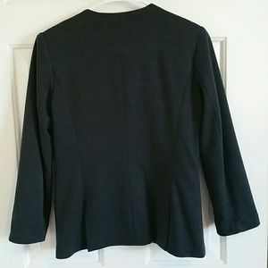 Nice collarless blazer 100% cotton. Flap pockets and polka dot lining one button in front of jacket. One tiny spot barely noticeable on back of jacket. Overall Great condition
