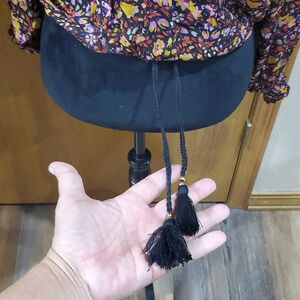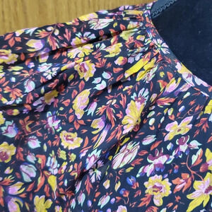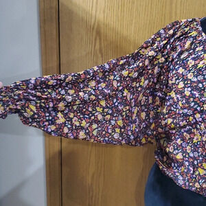 beautiful excellent condition no issues dark burgandy with pops of pink and yellow floral pattern lightweight sheer blouse tassle draw waist drop shoulder elastic cuff by anthropologie