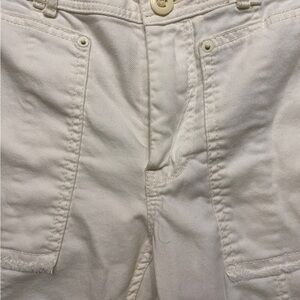 White cotton crops. Patch pockets on the front with zipper and double button closure. Also has belt loops. Painter’s pockets on the back with raw hem.
