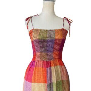 Anthropologie dRA Los Angeles Smocked Madras Plaid 100% Linen Jumpsuit Size Med