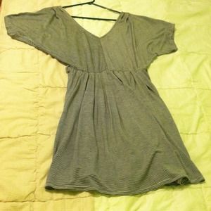 Black and white striped dress. Comes just over the knees. Open back in V shape.