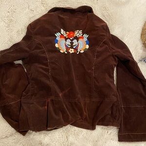Chocolate brown corduroy Embroidered embellishment Snap front Patches on elbows Distressed stitching Size large 22" sleeve 20" length 18" pit to pit 18" flat across front
