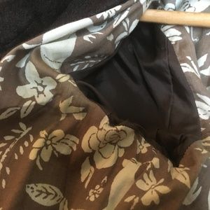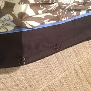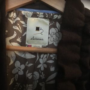 elevenses brand from Anthropologie. Size 2. Dark brown with ruffles and pockets. Outside feels like boiled wool (25% wool, 75% polyester). Cotton animal and flower print body lining. Dark brown acetate sleeve lining. Good condition. Some discoloration on inside underarms (see photo). 3/4 length sleeves. Hip length. 2 hidden fasteners (see photo) and cornflower blue strip on inside. Needs to be dry cleaned.