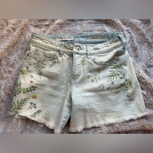 Stylish denim shorts with a floral print. Features a mix of green and purple hues. Slim boyfriend fit